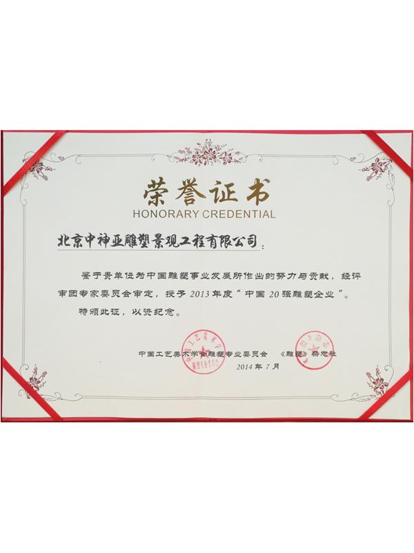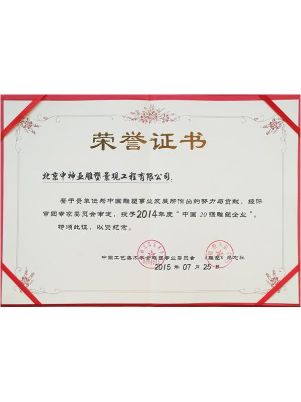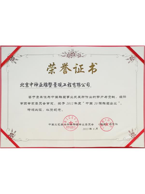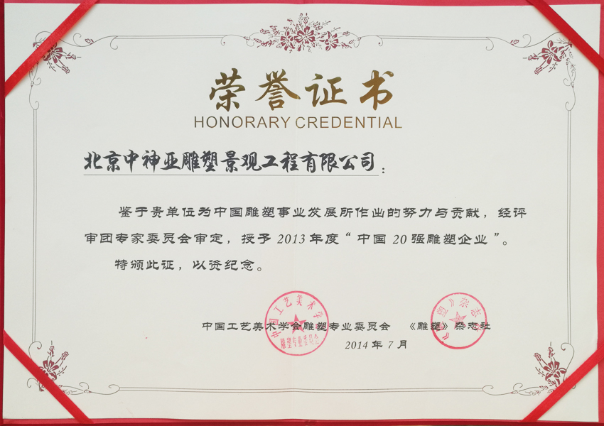 中神亞雕塑企業始建于1986年,(期前身為溫嶺藝術雕刻廠北京分廠)是設計和制作不銹鋼,鈦金屬,鍛銅,鑄銅,石刻等室內外雕塑的專業企業。是中央美術學院雕塑系和清華大學美術學院雕塑系實習創作基地,亦是中國美術家協會雕塑藝術委員會和中國工藝美術學會雕塑專業委員會特別推薦企業;是全國雕塑企業委員會副主任委員單位;是中國雕塑學會理事會員單位;2010年增選為中國建設文化藝術協會環境藝術專業委員會常務理事單位;2011年批準加入為中國建筑金屬結構協會會員,2012年增選為中國建筑金屬結構協會第十屆理事會理事單位;中國鋼結構協會團體會員;是具備住建部核準可承擔各種類型藝術鋼結構、藝術網架結構工程三級資質企業...